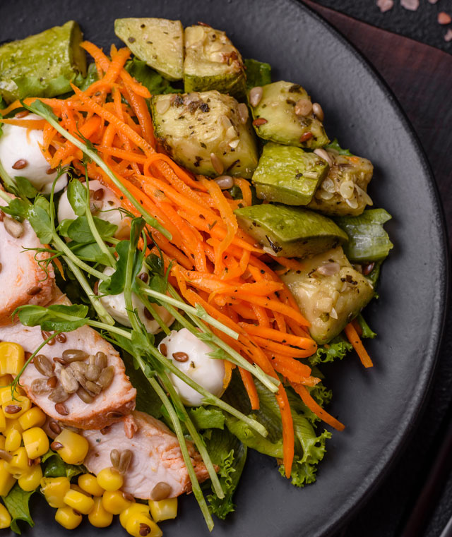 Perfectly prepared pasta tossed with fresh green and red peppers, black olives, onion, and garlic, in a light and zesty vinaigrette.
