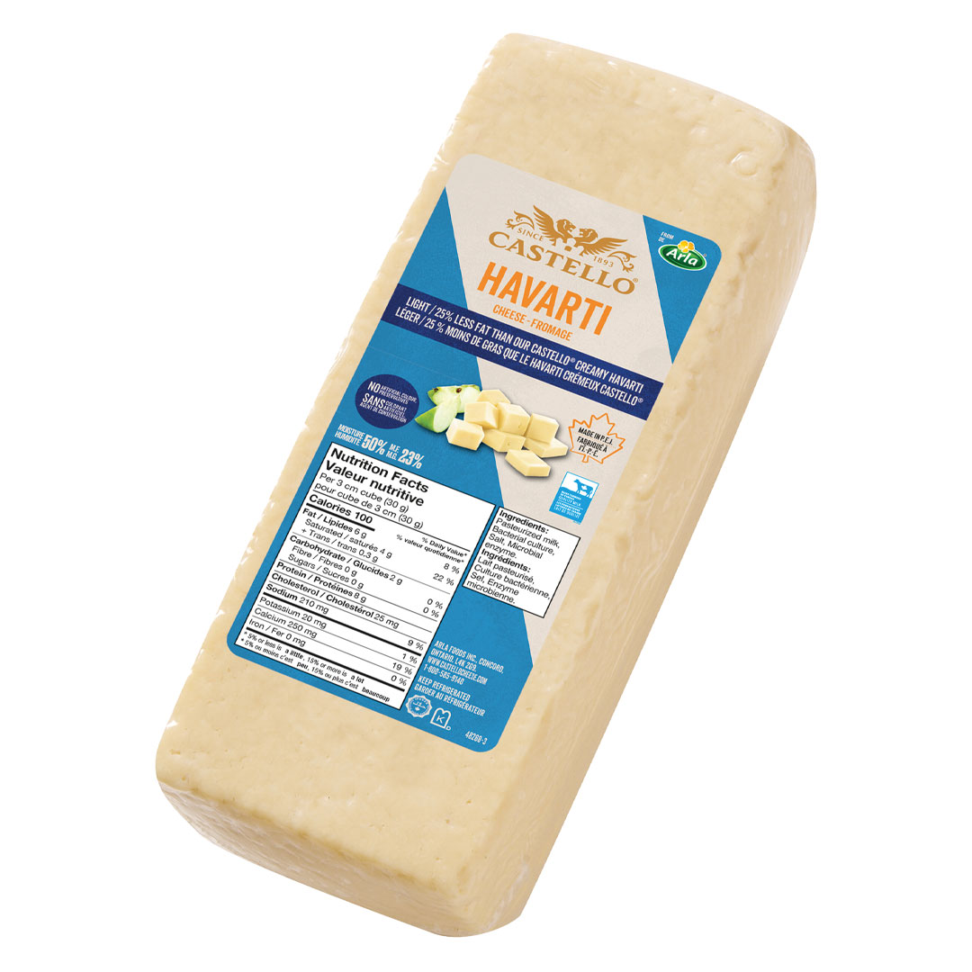 Castello Havarti Cheese 25% Less Fat is a lighter option for cheese lovers who want to enjoy the creamy goodness of Havarti with reduced fat content. Made with the same craftsmanship as traditional Havarti, this cheese offers a smooth and buttery texture with a milder flavor. With 25% less fat, it is a great choice for those looking to lower their fat intake while still savoring the delicious taste of Havarti. Whether enjoyed on sandwiches, melted in grilled cheese, or used in recipes, Castello Havarti Cheese 25% Less Fat allows you to indulge in the creamy satisfaction of Havarti with a lighter twist.