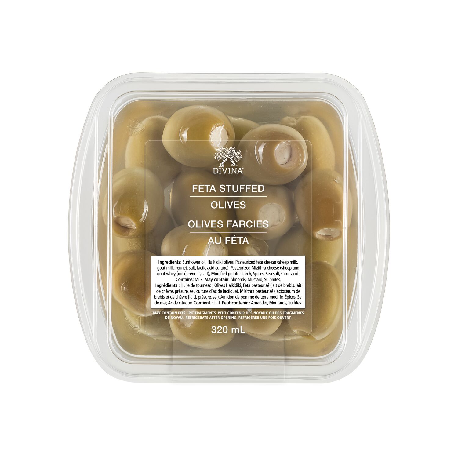 Hand-harvested and hand-stuffed green olives from Greece’s famed Halkidiki Peninsula are the perfect contrast to creamy, light Feta cheese. This irresistible treat is perfect tossed into a salad or paired with roasted peppers and prosciutto. We use a sheep’s milk Feta in this classic Divina recipe.