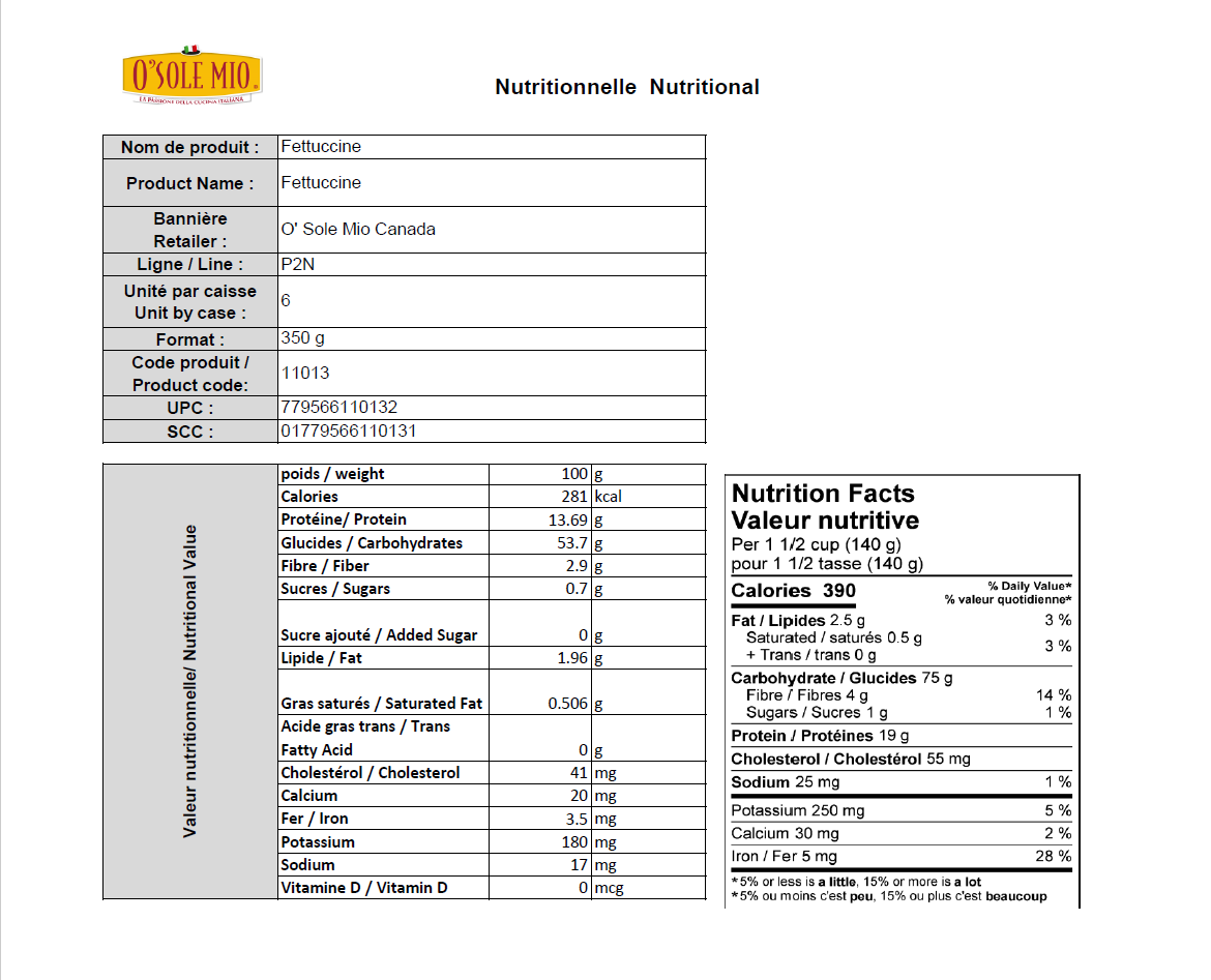 Fettuccine Fettuccine flat pasta Product Info Nutritional Info Ingredients Durum wheat semolina, Liquid whole egg, Water. Variants Certifications Product Gallery