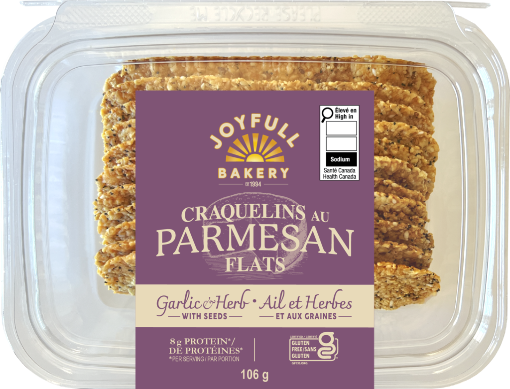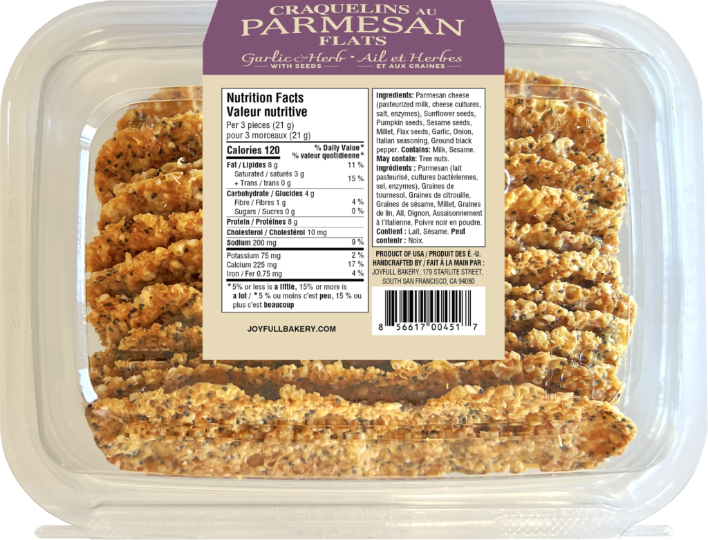 Joyfull Bakery® Garlic & Herb Seeded Parmesan Flats are 100% aged Parmesan, garlic and Italian seasoning oven-baked with 5 seeds (sunflower, pumpkin, sesame, millet and flax).