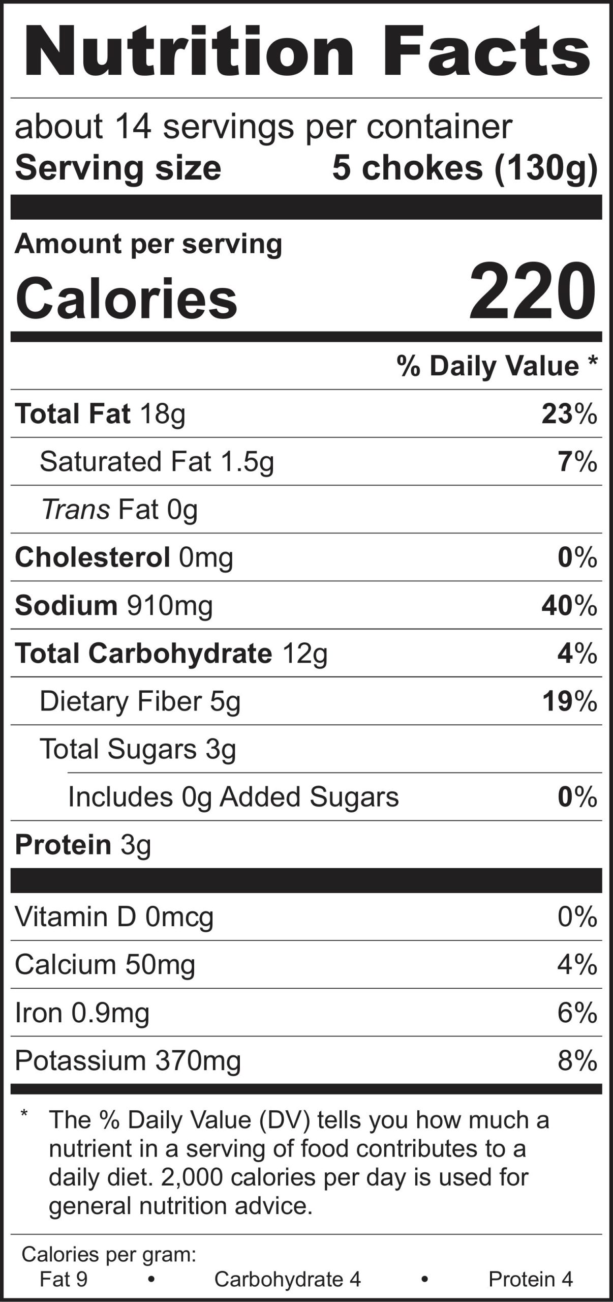 artichokes, sunflower oil, distilled vinegar, sea salt, dried garlic, citric acid, spices, ascorbic acid.