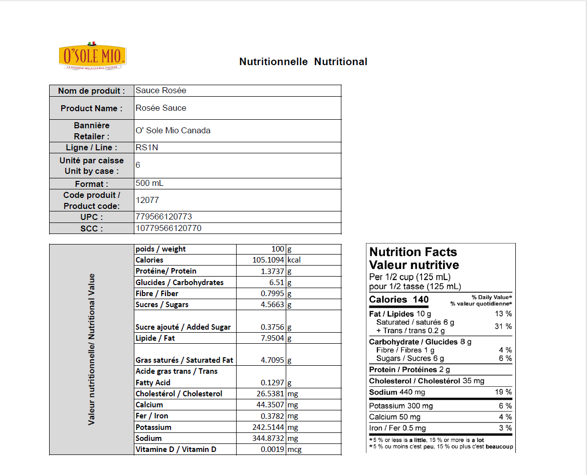 Italian tomato, Cream (cream, milk, dextrose, cellulose gum, guar gum, locust bean gum, mono- and diglycerides, carrageenan), Water, Onion, Green onion, Imported parmigiano reggiano DOP cheese (cow's milk, salt, rennet), Garlic, Modified corn starch, Extra virgin olive oil, Salt, Sugar, Herbs, Spices.