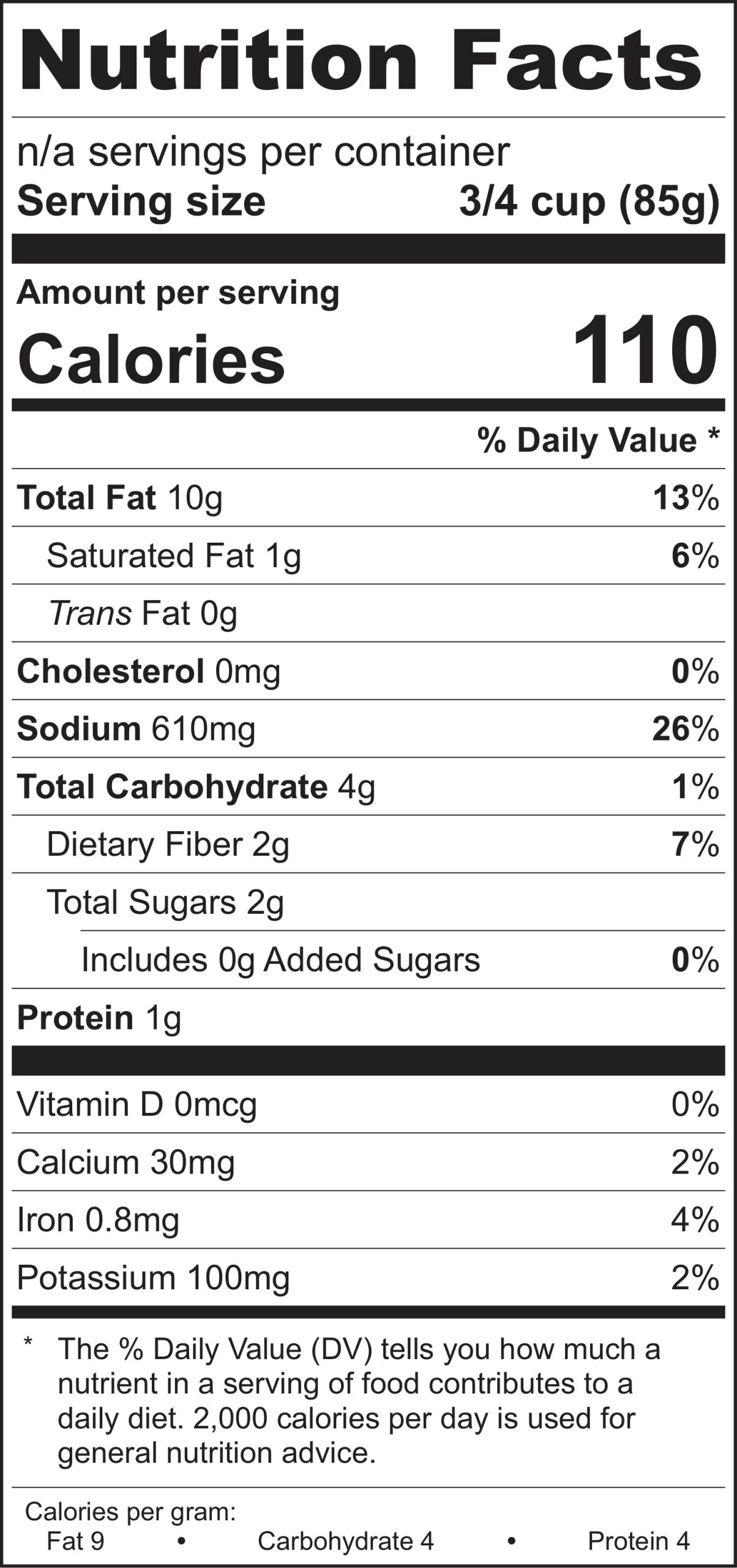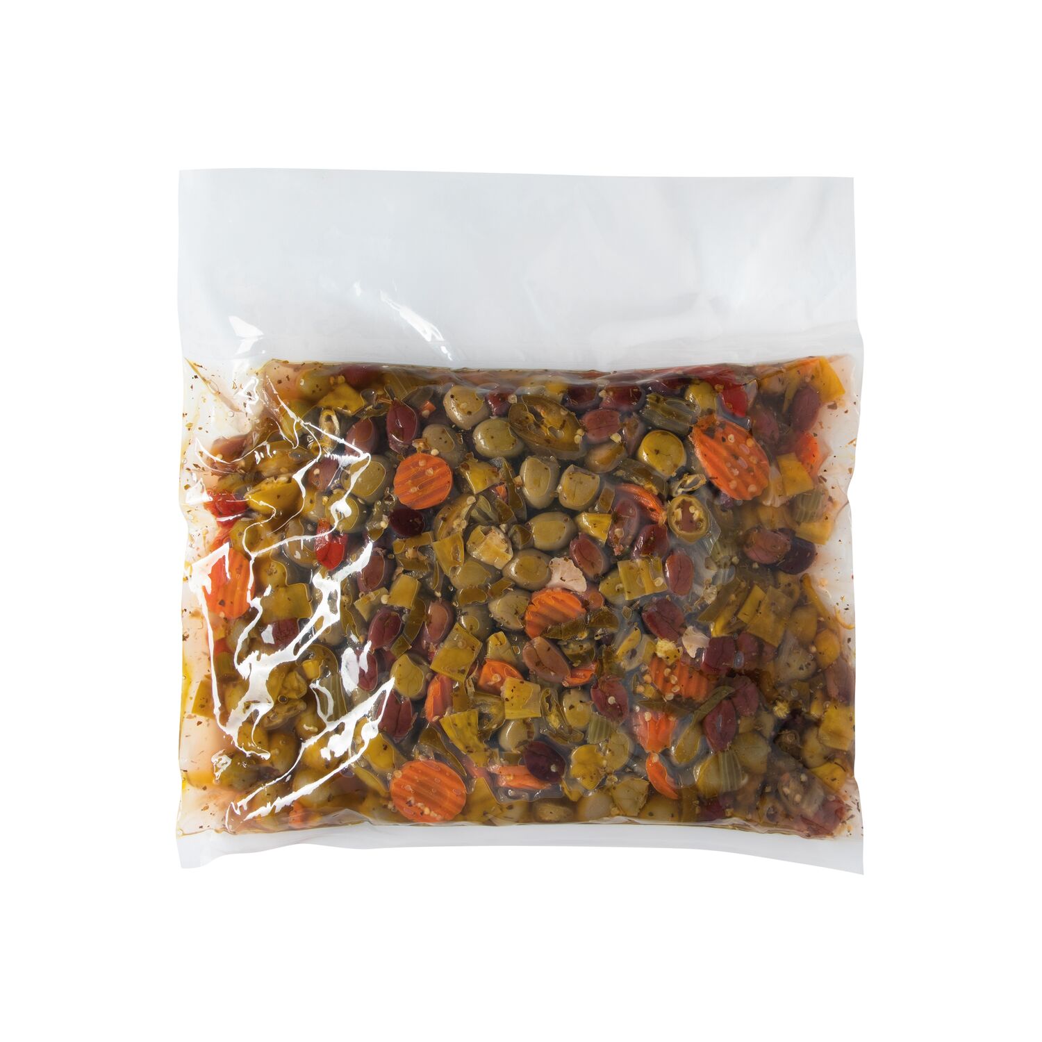 pitted olives (Greek olives, Kalamata), white wine vinegar, Florina red peppers, green peppers, jalapeño peppers, sunflower oil, pickled carrots, pickled cauliflower, pickled celery, spices, sea salt, citric acid.